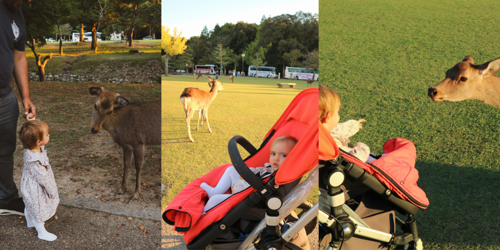 Nara es una ciudad donde los ciervos son considerados sagrados desde hace siglos y por esta razón están en libertad. Y sin duda es uno de los mejores sitios de Japón para ver con un bebé. ¡Es totalmente mágico y se puede visitar en una tarde fácilmente desde Kioto o Osaka! Nuestra hija se lo pasó genial alimentando y observando a los ciervos de cerca. Es una actividad tranquila, segura y perfecta para pasear con cochecito o mochila portabebés.